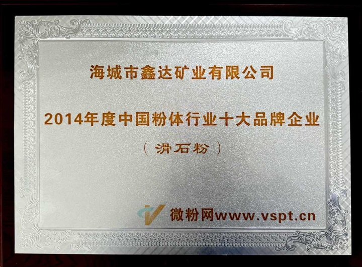 海城市鑫達鉱業有限公司2014年度中国分体業界十大ブランド企業(タルク粉)