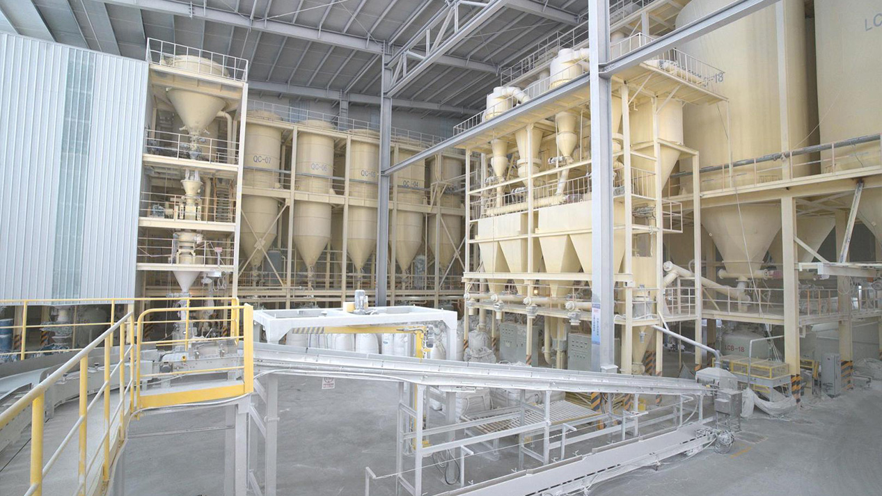 シンダー粉体工場の生産設備は先進的で、ドイツから輸入されたピール式気流研磨機2台、国内で先進的な2段階ホイール気流研磨機12台、篩過機2台、立研磨機6台を持っている。生産ラインは全過程でパイプチェーンを閉鎖して輸送し、外来汚染がなく、全自動包装生産ラインを導入し、製品包装上の袋、計量、計数、除塵、スプレーコード、高位パレタイジングなどの機能を実現する。原料上料は自動上料システムを採用し、タルク原料の配合比率、混合材料の自動化を実現し、原料の配合比率を信頼性、正確にし、製品指標は変動を減少し、製品の白度、色などの技術指標はより安定し、製品の品質が国内外の顧客の需要を満たすことを確保した。